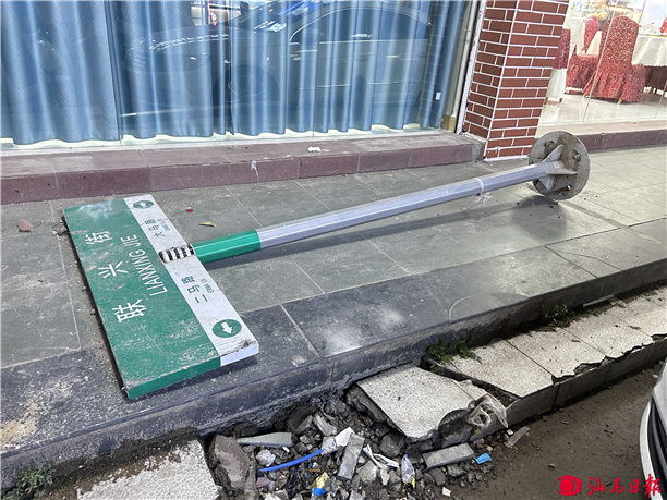 11月28日晚,記者在城區聯興街看到,聯興街的路牌被“連根拔起”放倒在一家飯店前面,上面有被踩踏的泥痕,旁邊臺階也存在損壞現象。路牌成為路障,影響市容市貌,影響市民通行,希望有關部門盡快予以處理。