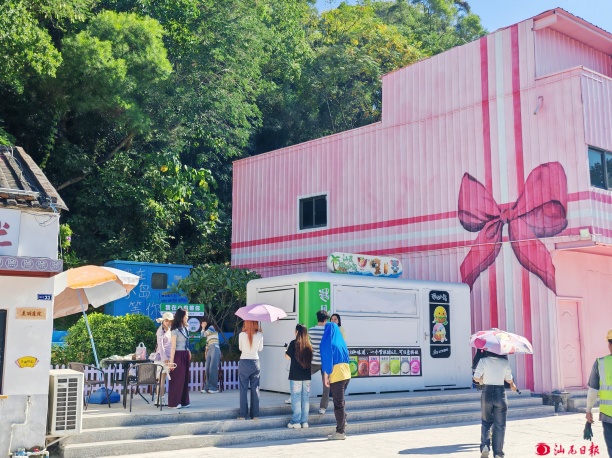 如果說咖啡館是“靜”態的空間更新,那么水吧街便是“動”態的文化煥活。2024年5月,原漁船廠員工宿舍僅用三天便完成拆除清理,緊接著又歷時四天完成改造,一座融合海陸豐非遺文化的主題水吧街驚艷亮相,創造了村莊改造的“七日奇跡”。每逢節假日期間,這里便成了非遺文化的展示舞臺,吹打樂、八音古樂、傳統戲曲伴奏輪番上演,游客手握特色飲品,耳畔是悠揚的百年民樂,眼前是湛藍的碧海藍天,沉浸式體驗非遺文化的獨特魅力。“以前總覺得老音樂過時,沒想到現在成了吸引游客的招牌!”年輕村民小陳笑著分享自己的觀念轉變。