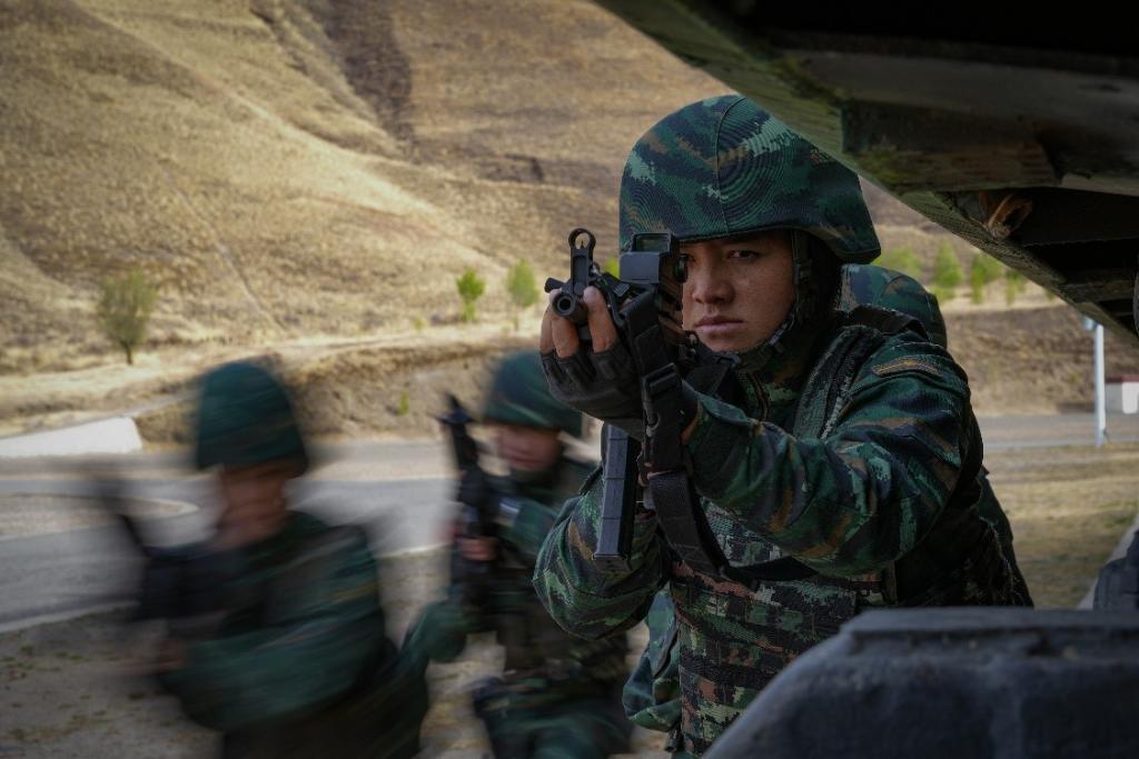 ↑達(dá)娃卓嘎(右一)和戰(zhàn)友進(jìn)行戰(zhàn)術(shù)訓(xùn)練
