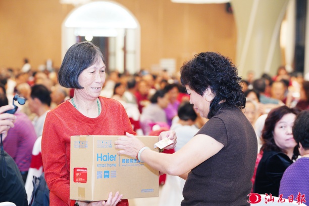 參加活動的老人開心地領(lǐng)取抽獎禮品。