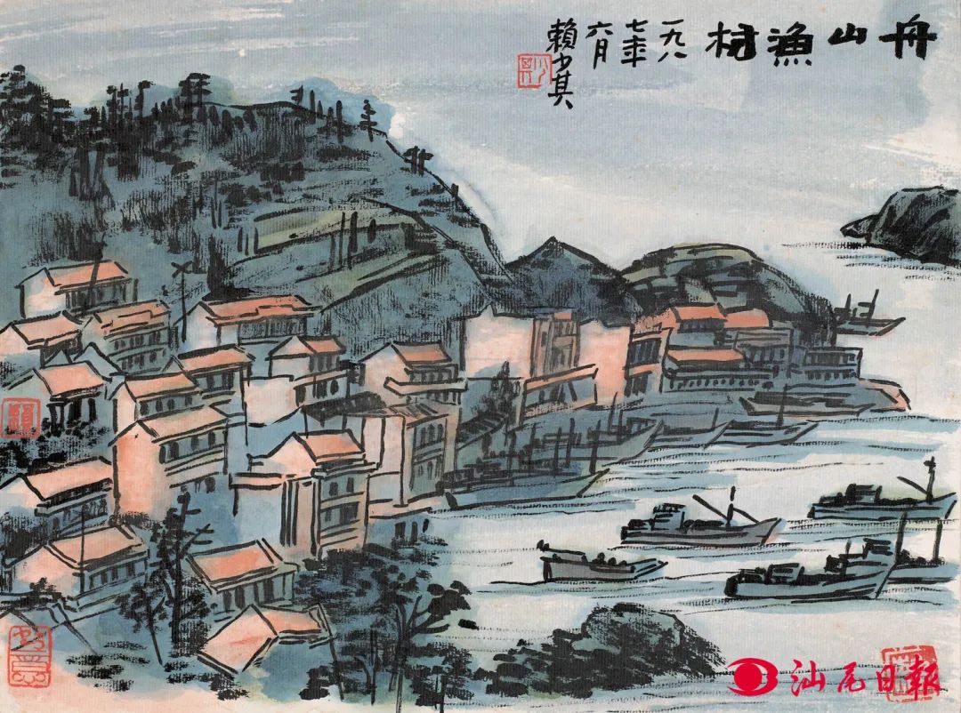《舟山漁村》筆畫簡約勾勒出口岸熱鬧的景象:在遠處山上依稀可見一小片樹林,下面房屋連片——都是兩三層的小樓房。近處有幾艘漁船靠在岸邊,大概漁民捕魚歸來了。遠處還有四五艘漁船漸漸駛出岸邊,貌似要出海捕魚……從中可見:小小的漁村已改頭換面!漁民靠海吃海,在好政策的支持下,發揮自己的聰明才智打魚、賣魚,經濟好了,住上了“小洋房”!
