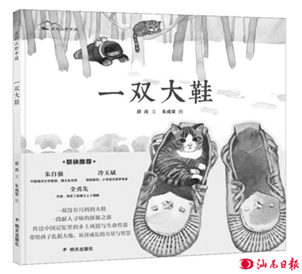 值得一提的是,《一雙大鞋》是明天出版社“我的山野中國”圖畫書系列之一,單從這本書來看,“我的山野中國”圖畫書系列不僅在自然的山野,與之相連的更有生活的山野與心靈的山野。當(dāng)下兒童的生活日益城市化,與自然世界存在諸多隔膜,那么在不太能回歸自然山野的大背景下,通過閱讀這些故事,通過品味故事里的人生,多增閱歷多長見識,領(lǐng)悟一些關(guān)于山野的生活智慧,在心靈之中葆有山野的清新靈動,終究是一件幸福的事情。