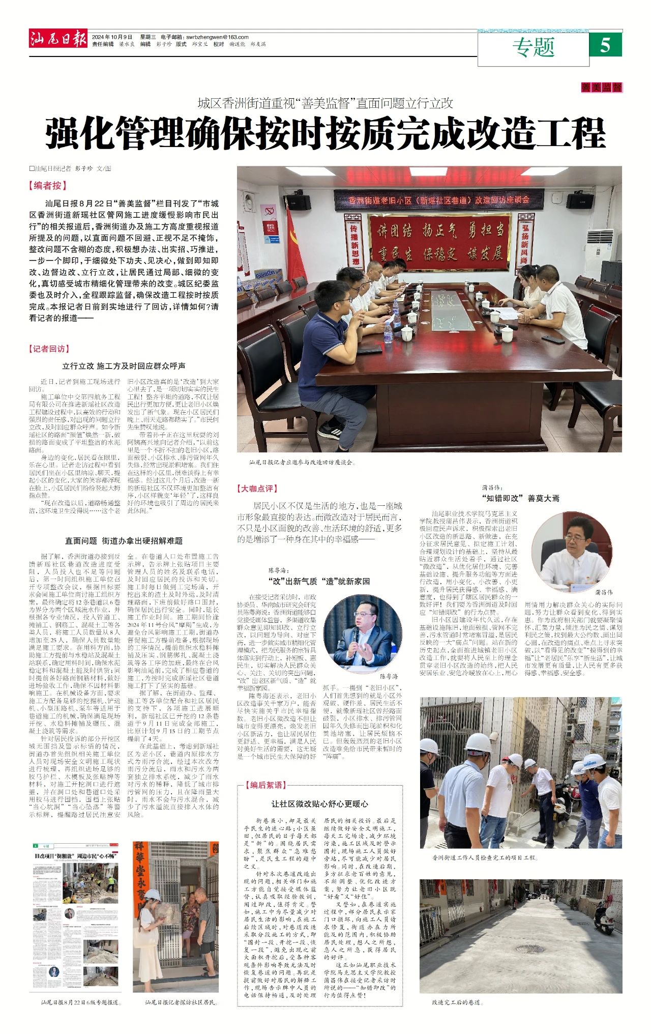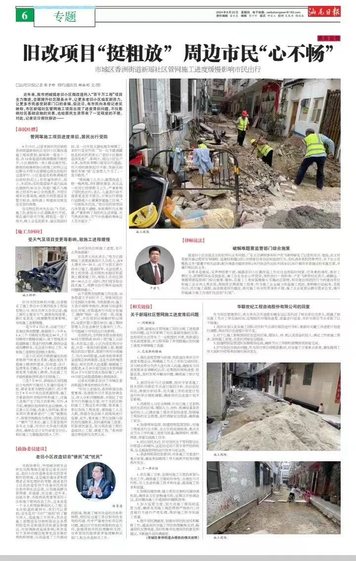 汕尾日報(bào)8月22日“善美監(jiān)督”欄目刊發(fā)了“市城區(qū)香洲街道新瑤社區(qū)管網(wǎng)施工進(jìn)度緩慢影響市民出行”的相關(guān)報(bào)道后,香洲街道辦及施工方高度重視報(bào)道所提及的問題,以直面問題不回避、正視不足不掩飾,整改問題不含糊的態(tài)度,積極想辦法、出實(shí)招、巧推進(jìn),一步一個(gè)腳印,于細(xì)微處下功夫、見決心,做到即知即改、邊督邊改、立行立改,讓居民通過局部、細(xì)微的變化,真切感受城市精細(xì)化管理帶來的改變。城區(qū)紀(jì)委監(jiān)委也及時(shí)介入,全程跟蹤監(jiān)督,確保改造工程按時(shí)按質(zhì)完成。本報(bào)記者日前到實(shí)地進(jìn)行了回訪,詳情如何?請看記者的報(bào)道——
