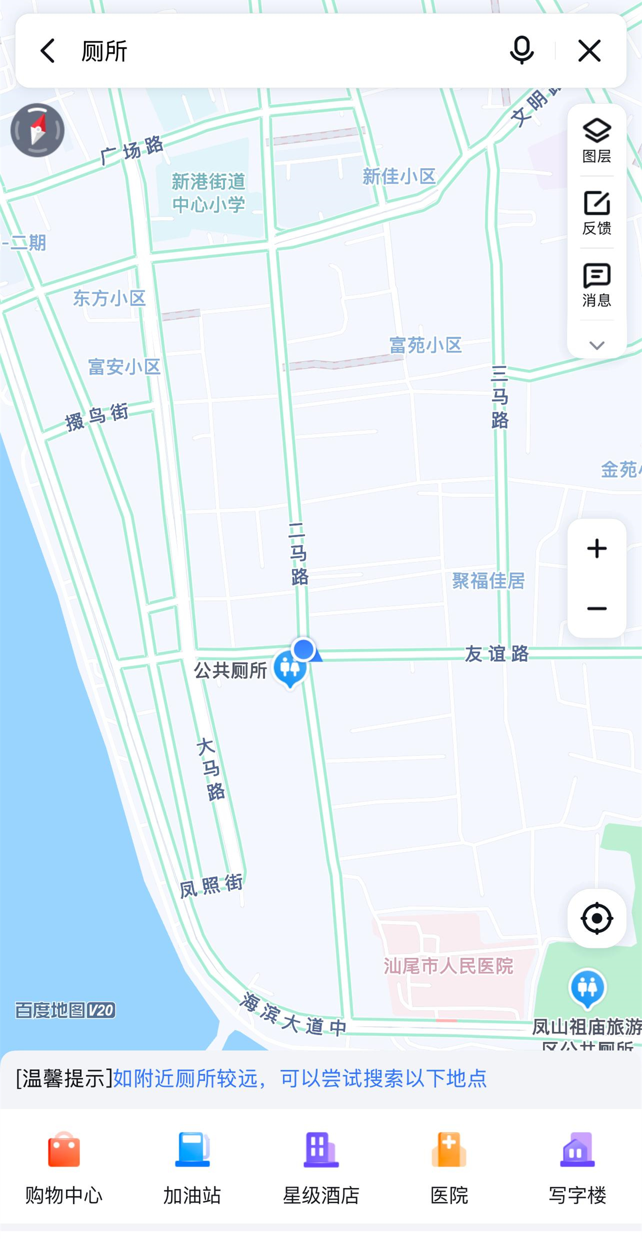 手機APP顯示二馬路全程僅有一個被標識的公共衛生間。