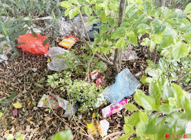 記者看到,公園入口處植被茂盛,生態環境總體良好。但深入內部后,問題逐一顯現:綠化帶中散落著零食袋、礦泉水瓶、果皮等生活垃圾,部分角落堆積嚴重;入口廣告牌漆面斑駁、破損不堪;園內標識牌東倒西歪,方向指示牌內容缺失,給游客帶來不便;木棧道地板和休閑座椅也存在不同程度的破損。