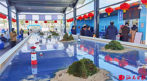在海港文旅碼頭,紅燈籠高高掛起在候客大廳四周,節日氛圍濃厚;大廳中間還擺放著大型海洋場景模擬沙盤,布置模擬出海域、小海島以及各類船舶,作為船舶科普宣傳供等待登船的市民游客參觀。大年初一,記者在候客大廳看到,市民游客正在參觀大型海洋場景模擬沙盤,等候“藍海豚6”停靠碼頭。據了解,目前,客船“藍海豚3”環品清湖航線每天開設3個航班;“藍海豚6”龜齡島航線每天開設8個航班。