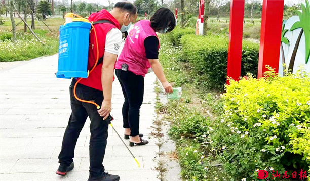 工作人員對(duì)轄區(qū)綠化帶進(jìn)行全面消殺。