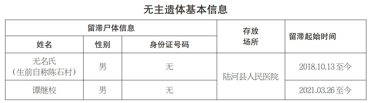 自公告發布之日起60個自然日內仍無人認領的遺體,陸河縣人民醫院將按《民法典》《殯葬管理條例》等相關法侓法規規定,依法申請衛生行政主管部門和公安機關將尸體處理。