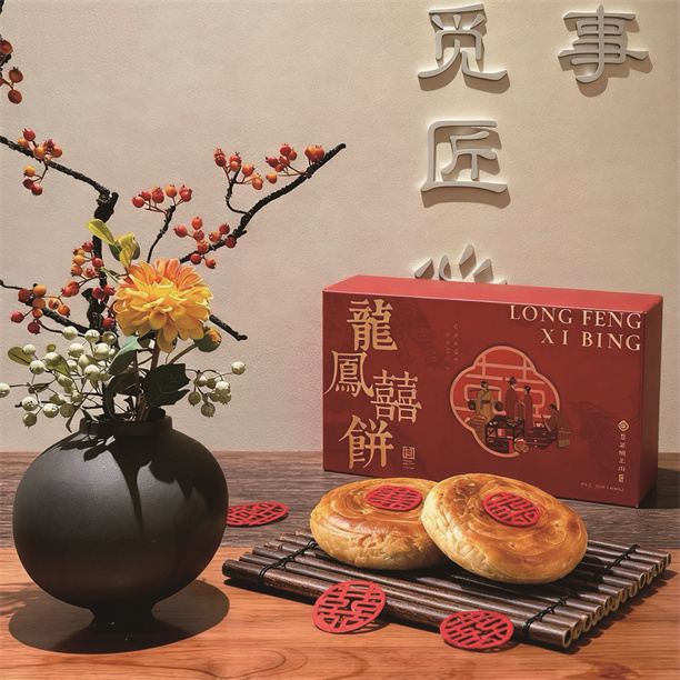 在喜覓瑤元閣的眾多產品中,最讓汕尾老百姓牽掛的莫過于龍鳳喜餅。這餅是汕尾嫁娶儀式里的“硬通貨”,餡料精選杏仁、核桃仁、瓜子仁、光中杏、欖仁等按比例搭配而成的伍仁,咬開滿是堅果油香;餅皮更見功夫,水油酥工藝要經過五次折疊、三次醒發,烤好后輕碰即碎,酥皮簌簌落在掌心,卻不沾手。在全新升級的龍鳳禮盒里,伍仁喜餅與雙黃椰絲白蓮蓉喜餅分別象征著五谷豐登與連生貴子。開店至今,瑤元閣已為上萬對新人定制過龍鳳喜餅,不少在外打拼的汕尾人哪怕隔著千里,也要線上訂購,讓“家鄉味”見證自己的婚禮。